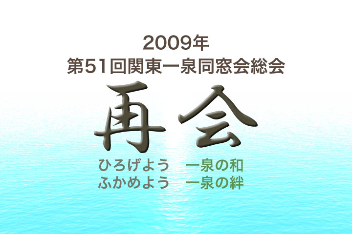 2009年10月24日開催の第51回関東一泉同窓会・総会に同窓生の皆様におかれましては、ご多用の中351人もの方々にお集り頂き、大盛会にして頂いたことに幹事一同大変感激し、心より御礼申し上げます。いたらぬところも多々あったと思いますが、皆様の暖かい声に励まされ、無事同窓会・総会の運営という大任を全うすることができました。本当にありがとうございました。